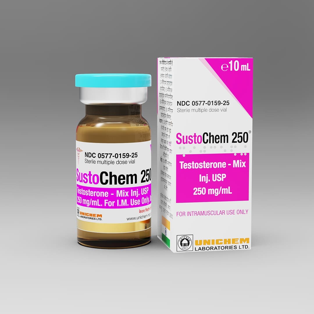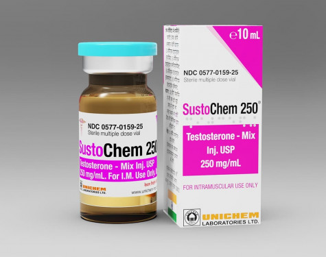 SustoChem 250 ® – это композитный тестостерон, который состоит из четырех эфиров: 30мг про-пионата, 60мг фенилпропионата, 60мг изокапронатаи 100мг деканоата. Такое сочетание длин-ных и коротких эфиров позволяет быстро ощутить действие препарат и пролонгировать его дей-ствие, что в совокупности нивелирует стероидные ямы.